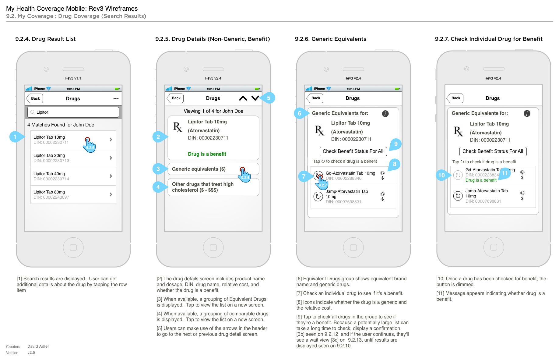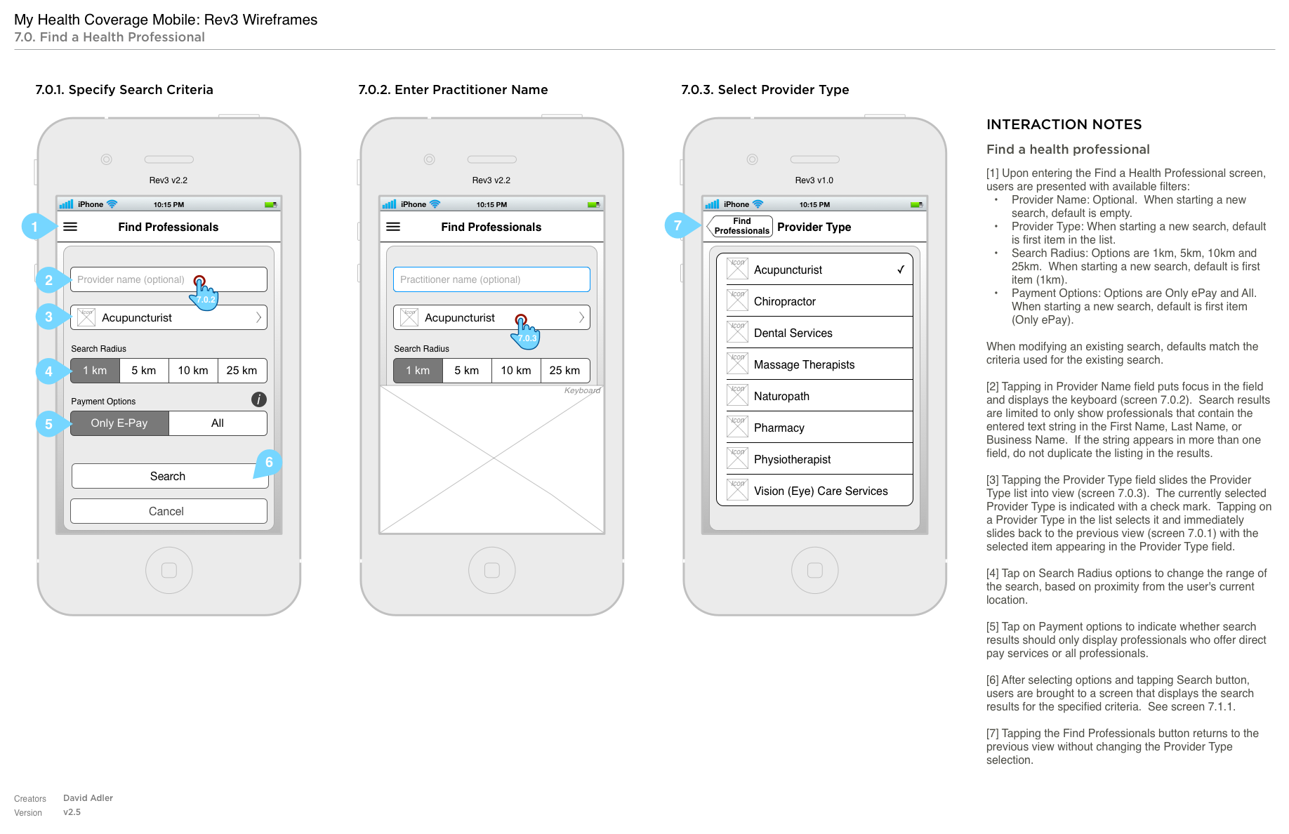 Medavie Blue Cross in Canada has a mobile application that allows subscribers to access information about their plan and benefits. I created detailed wireframes showing the screens and interactions. Below are examples of screens for searching for nearby providers and checking coverage benefits.